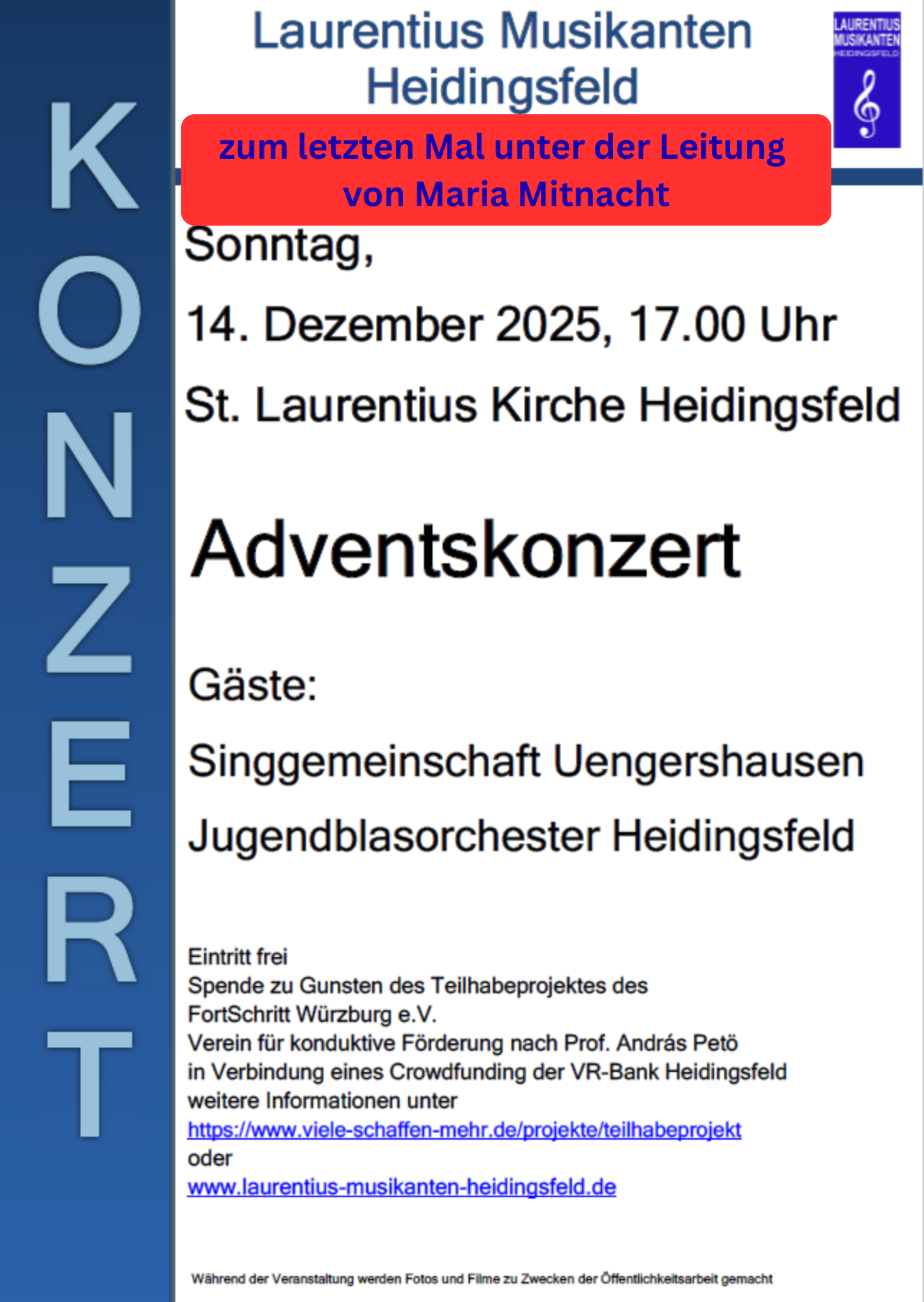 Nach sieben Jahren wird Maria Mitnacht im Dezember 2025 ihre musikalische Leitung bei uns abgeben und die Laurentius Musikanten Heidingsfeld als Dirigentin verlassen. Die Jahre, in denen Maria die musikalischen Geschicke unserer Kapelle gelenkt hat, haben uns sehr geprägt – wir werden sie in unseren Reihen schmerzlich vermissen.